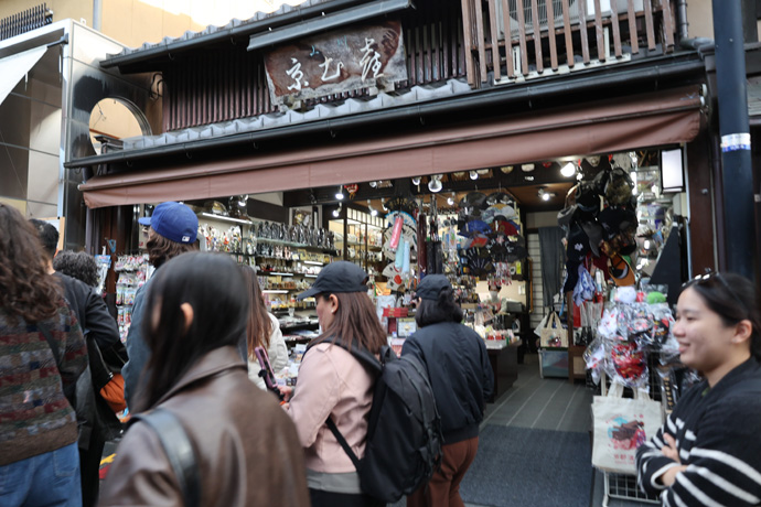 「上川商店」 京土産のお店で、Tシャツ、おき物、キーホルダー、八ツ橋、和装小物、漬物、陶器などが所せましと並んでいます。