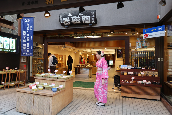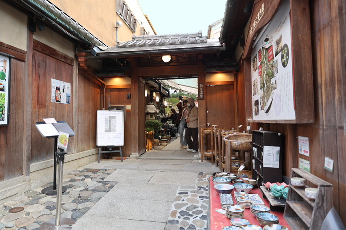 奥に京焼・清水焼の「朝日堂」関係のお店やギャラリー、工房が並び、向うを通る「ちゃわん坂」までは「あさひ坂」とも呼ばれています。この日はギャラリーで「山口沙矢 陶展」を開催していました(11月24日まで)。