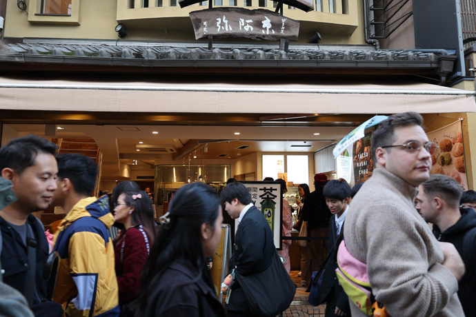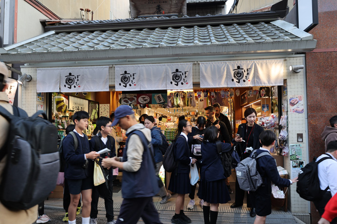 「京みやげ西秀」 様々な京みやげがあり、暖簾は京都ばあむ、店内にはおたべ(粒あん入り生八ッ橋)のミニ版「こたべ」が並んでいます。清水寺に近づくにしたがって混雑がはげしく、写真がうまく撮れません。