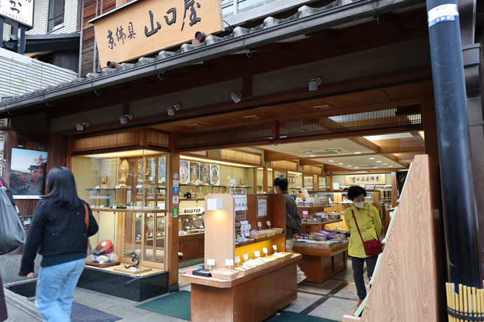 「山口屋」 京仏具のお店で、念珠を中心に仏像、仏具、線香など豊富に取りそろえています。お香のかおりが漂っています
