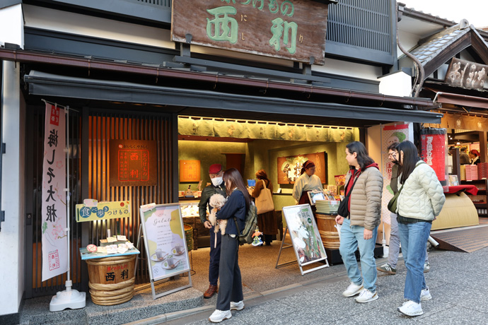 「京つけもの 西利 清水店」 老舗の漬物屋さんで、千枚漬やすぐきなどの伝統的な漬物だけでなく、ラブレ乳酸菌を使った商品、七味大根、食べ歩きキュウリなども製造販売しています。