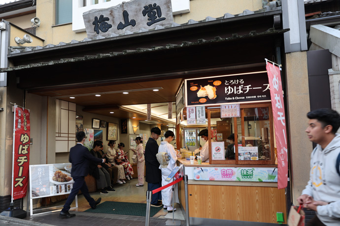 「湯葉チーズ本舗 清水店(梅山堂第二営業所)」 大人気の「湯葉チーズ」をはじめ、各種の揚げたての串を店頭販売しています。落ち着いた店内で頂いたり、食べ歩きにも最適とか。