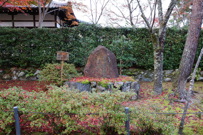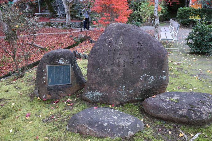 本堂前庭の北の一段高くなったところに、「溪仙賛歌」という歌碑があります。佐々木信綱「よろずはの 春秋かけて たまごむる 筆のあととわに あらんとおもへど」、吉井勇「溪仙の 墓をもとめて言葉なく われらのぼりゆく 落葉のみちを」、秋艸道人(会津八一)「ここにして きみがゑがける みやうわうの ほのほのすみの いまだかわかず」。明治から昭和初期に活躍した日本画家・冨田溪仙に対する賛歌で、二尊院に墓があります。