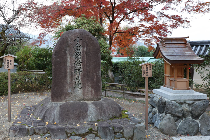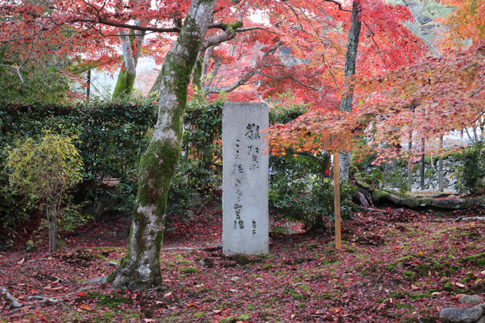 「西行法師庵の跡」の石標、看板には「我が物と秋の梢を思ふかな小倉の里に家居せしより」とあります。西行は鳥羽上皇に仕える武士でしたが、22歳のとき妻子を捨てて出家し、小倉山麓のこの山門近くに庵を営みました。