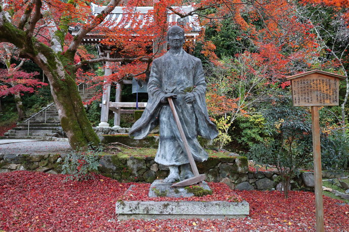 「角倉了以」の銅像 安土桃山時代の豪商でこの地の出身。土倉経営(金融業・質屋)を中心に秀吉の朱印船にも加わり莫大な富を得て、大堰川、高瀬川、富士川、天龍川を開削。二尊院の道空に師事し仏道にも励み、晩年は大悲閣に隠棲しました。
