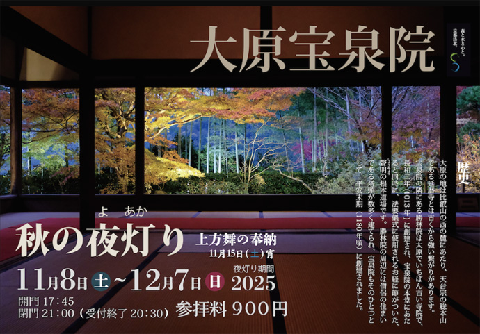 宝泉院では11月8日から12月7日の期間『秋の夜灯り』として夜間特別拝観が行われています。