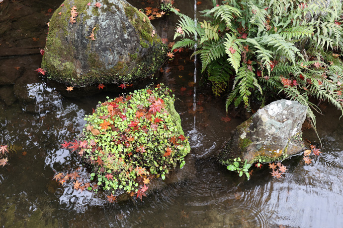 庫裏の玄関の前に小さな池があり、奥の滝組から水が流れ込んでいます。
