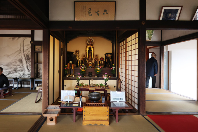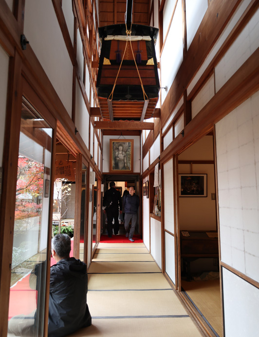 建物に入ると廊下の天井に駕籠がつるされています。郊外や山里の寺でよく見ることがあり、住持やお客が使用したものと思われます。天井は安土桃山時代の1600年、伏見城で自決した鳥居元忠の板間が移されたといわれています。