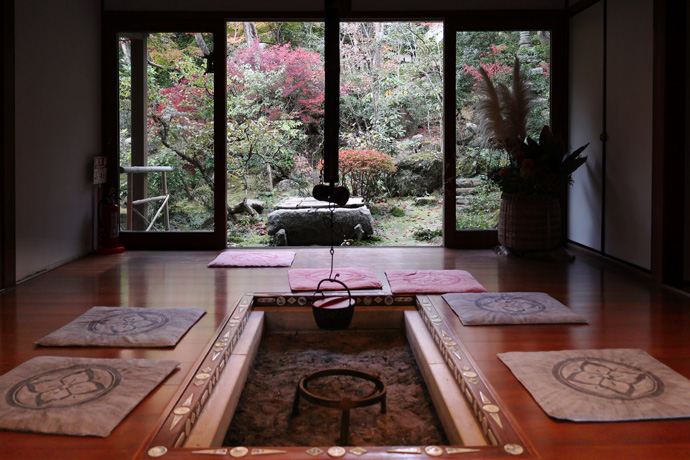 廊下の右手にある「囲炉裏の部屋」 炉の周囲に陶板をあしらい、右隅に花が生けられ、床の間には寺宝が飾られています。四季を通じて趣のある山荘のような部屋です。