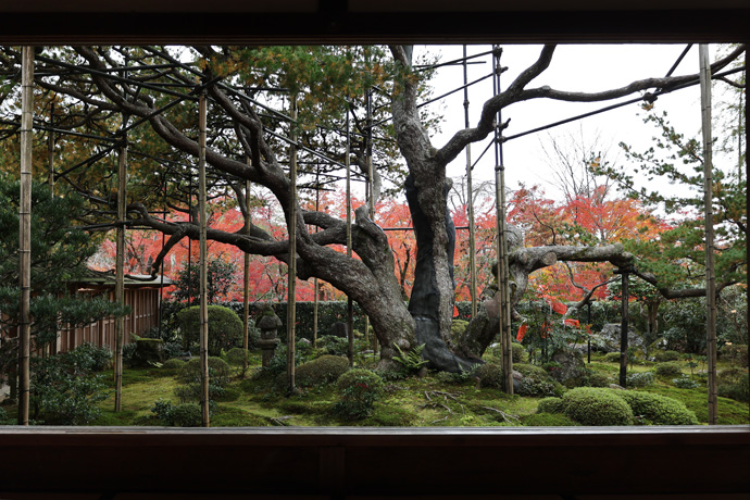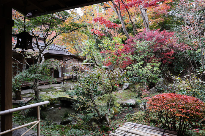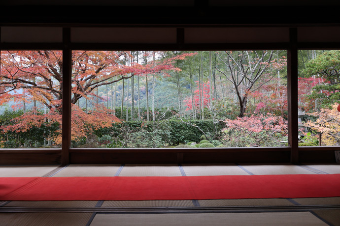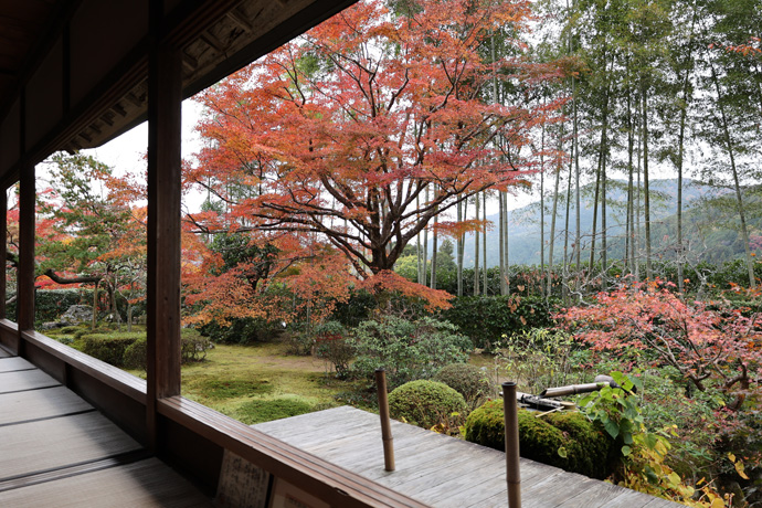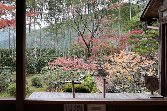 西の方は、かっては下の大原の里が眺められ、現在は竹林が借景になっています。宝泉院の庭は「額縁庭園」とされ、部屋の奥から額縁のように眺めるのが美しいといわれています。