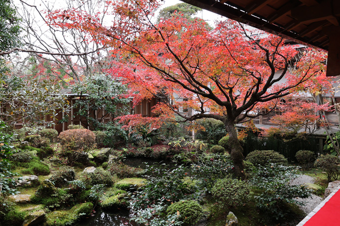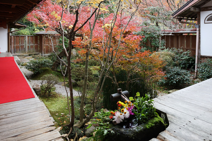 中庭に面して、庫裡と客殿に外縁が設けられ、その角に蹲(つくばい)があります。庫裏の外縁には毛氈が敷かれてお茶席になることもあります。