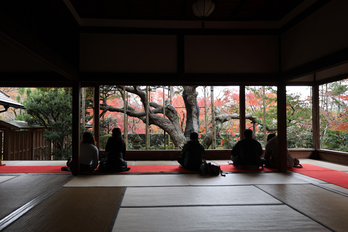 以前、ご住職の藤井宏全(こうぜん)さんが客殿におられることがありました。その時は、参拝客を部屋の中央に座らせて額縁庭園の鑑賞法を説明されていました。現在では参拝客が増えて同じようにはいかないようです。