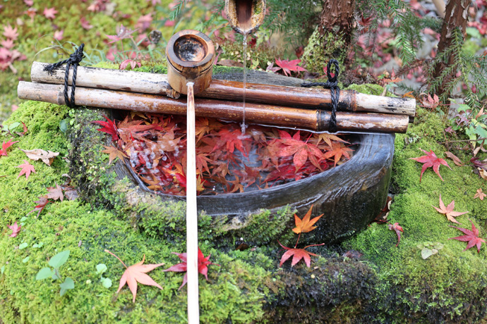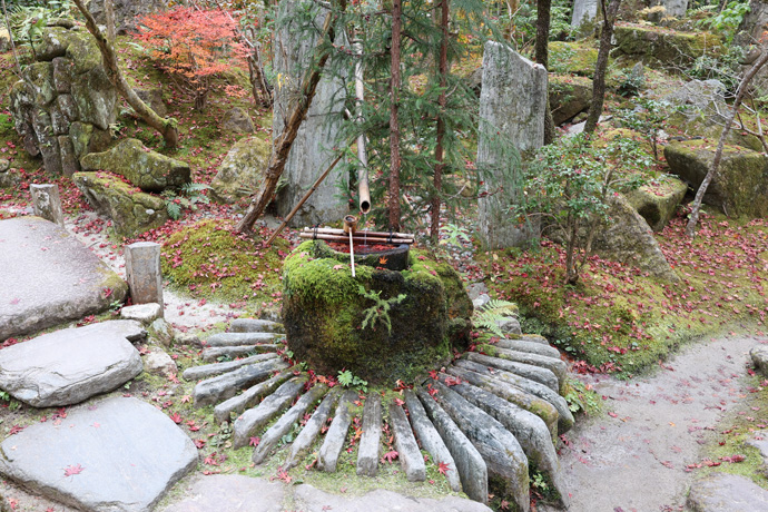西庭の縁の右端に「理智不二(りちふに)」と名付けられた珍しい二連式の水琴窟があります。竿の先に耳をつけると軽やかな音色が聞こえます。