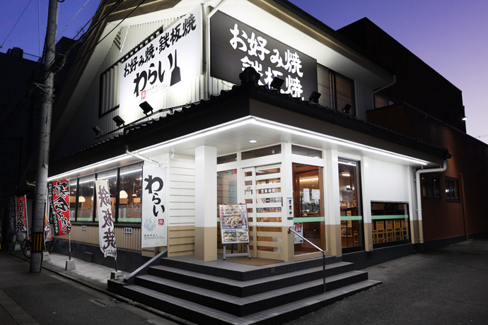 「錦わらい 吉祥院店」 京都・錦生まれのお好み焼き・鉄板焼のお店で、名物の「わらい焼き」や「京天焼」、焼きそば、鉄板焼きなど、豊富なメニューが楽しめます。ランチにもディナーにも利用でき、宴会プランなども用意されています。