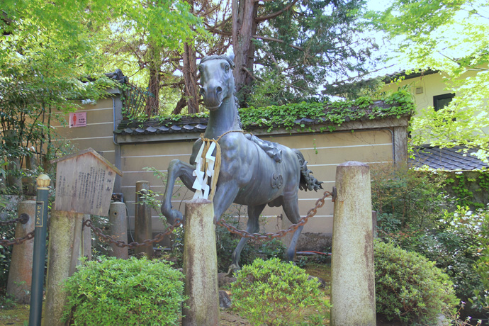 平安時代前期の嵯峨天皇の時代、弘仁9年(818)日照りの際に朝廷より奉幣使が遣わされ、以後雨止には白馬を、雨乞いには黒馬を奉納する祈雨神事が始まったとされます。(下は奉納された神馬像)