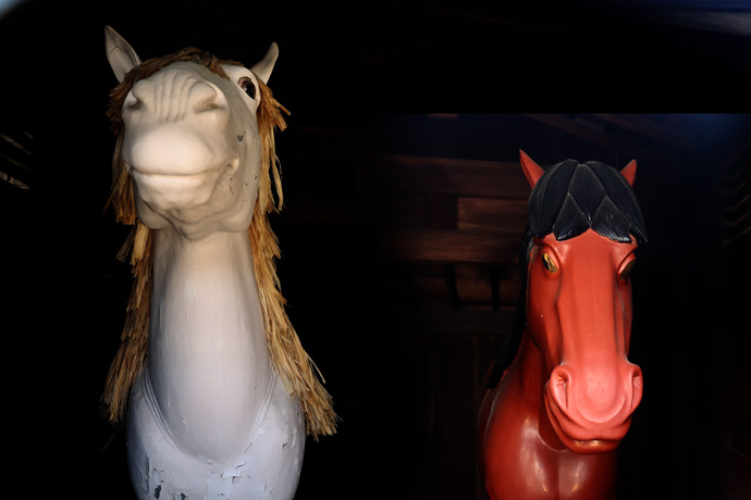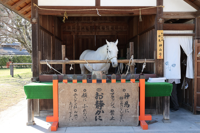 明治8年までは実際に境内で神馬が飼われていましたが、現在は木製神馬2頭が安置されています。かっては正月7日に青馬を見ると邪気を祓うとされ、大伴家持「水鳥の鴨の羽の色の青馬をけふ見る人は限りなしといふ」(万葉集)。