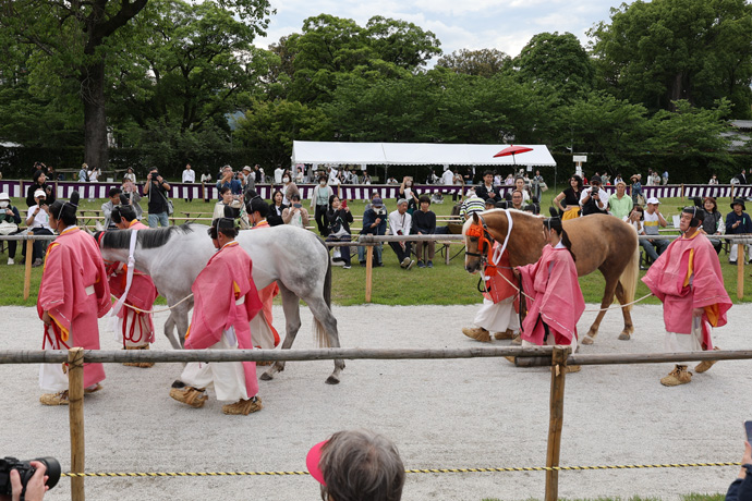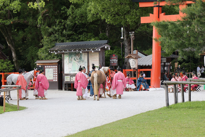 5月15日の葵祭上賀茂神社の社頭の儀は二の鳥居の内側で行われ、一般の見学者は中に入れません。下は「牽馬(ひきうま)の儀」で、馬寮使が御馬(神馬)を引き連れて二の鳥居の中に入り、上賀茂神社の御祭神にお目に掛けます。