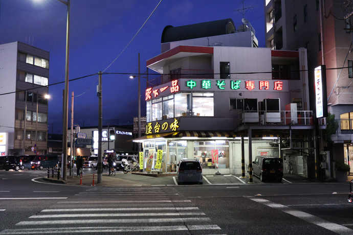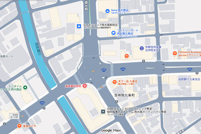 交差点の南東は「天下一品 九条店」。こってりラーメンで知られる天下一品は1971年に京都の屋台から始まり、全国で201店舗を展開しています。こちらの店は鶏のもも焼きも名物だそうです。