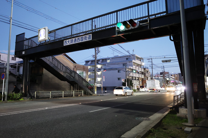 歩道橋の向こうは「西国街道」。江戸時代に再整備された街道の一つで、京都の羅城門(東寺口)から下関、あるいは九州の太宰府までの経路です。律令時代に大路として整備された山陽道とほぼ一致します。