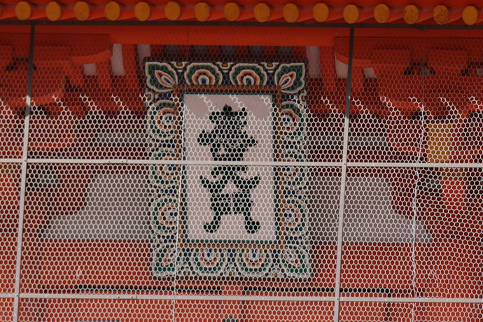七不思議5「本殿の鬼門封じ」 大極殿の東北(丑寅の方角)の角は鬼門に辺り、石垣や屋根の角が削られています。いままで、この場所は立入できなかったのですが、大極殿が塗り替え工事中であるために特別に見学できるようになりました。