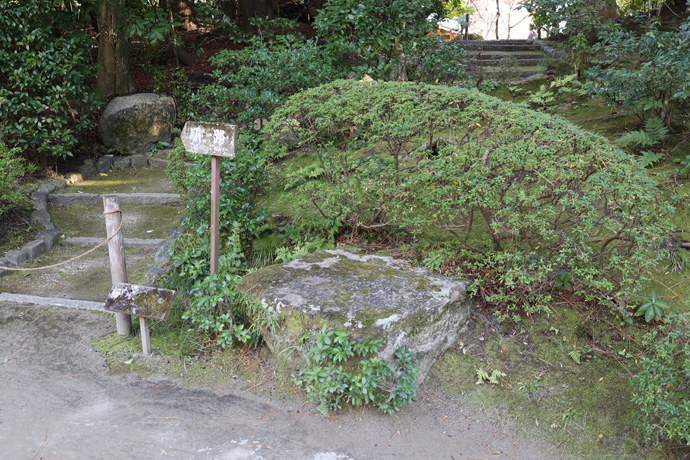 七不思議6「西神苑の石」 神苑は南禅寺界隈の別荘群と同じく7代目小川治兵衛の作庭です。琵琶湖疏水の水を巧みに使った自然を表した庭で、この石からの眺めを意識しているそうです。対岸の滝から水が流れ込みます。