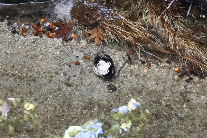 そのおかげで外来魚が入ってこなくて、本来の琵琶湖の生態系が保存されているといわれています。イチモンジタナゴは環境庁のレッドリスト、1A類、滋賀県の絶滅危惧種で、貝の中に卵を生むことで知られて神苑でその繁殖が確認されています。