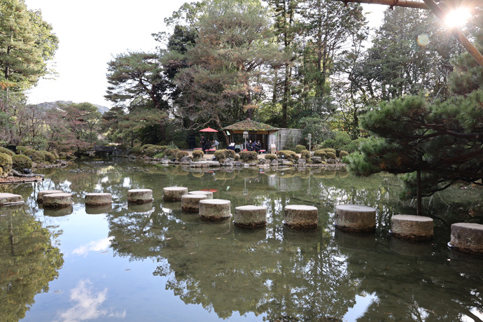 七不思議9「東神苑」 広い「栖鳳(せいほう)池」があり、栖鳳とは鳳凰が棲むという意味だそうです。右にある建物は御所から移築した「尚美観」(貴賓館)、左は「泰平閣」(橋殿)で借景は華頂山です。