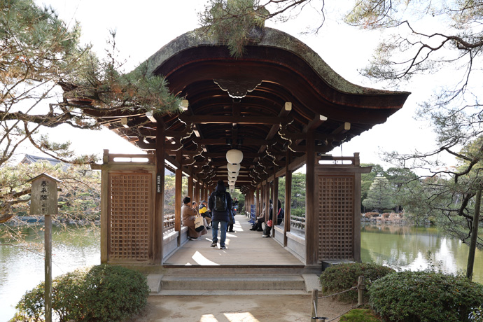 本殿の左にある建物は「白虎楼」(重文)で、大極殿と歩廊でつながる左右の楼閣のうち、西の建物です。西歩廊の途中に「神苑」への入口あります。 他の七不思議は神苑の中にあります。