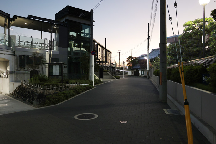 JPの線路沿いの北西に「妙玄寺」があります。単立(本門法華宗)の寺院で特に情報はありませんが、左手前の歩道沿いの三角スペースはお寺の私有地のようで、掲示板と石碑があります。