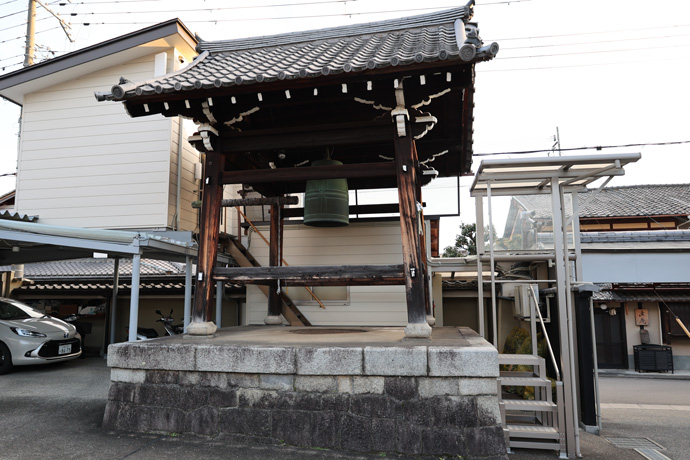 曹洞禅の高僧・大雲永瑞を開山、成政の舎弟・本祝宗源和尚を開基として迎えました。実際には、大雲永瑞はすでに故人であるところから,その霊をもって開山としました。山門を入って右にある鐘楼、周囲は駐車場になっています。
