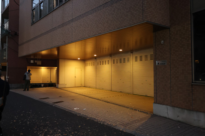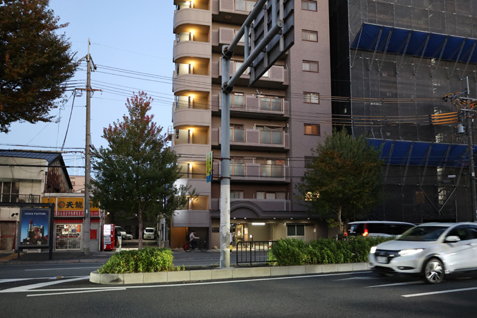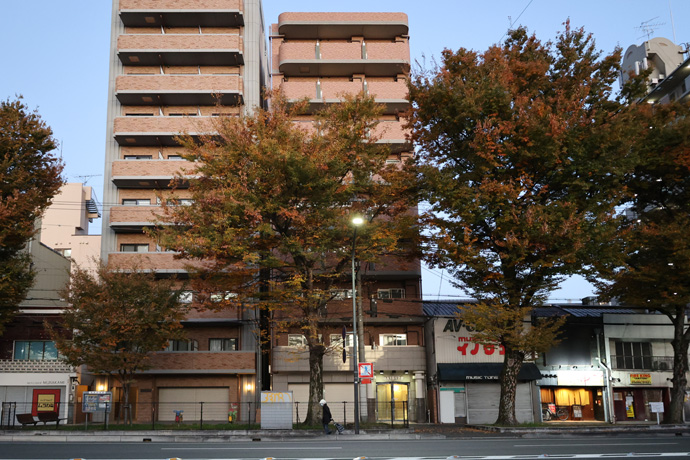 交差点の南西はイベントスペースの「DEAR京都西」、その向うは「ヲサダ石材店」です。その2軒をL字型に「八条ビル」が囲み、右手の赤い軒先テントはレンタルスペース 「iランドん西大路駅前八条」です。