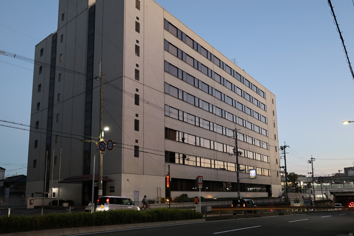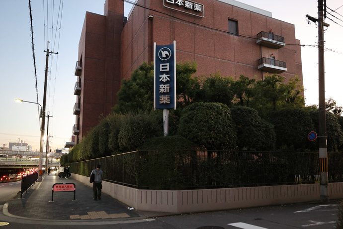 「日本新薬」 1919年に創立した製薬会社で、2025年の売上高は業界18位の中堅、新薬開発や研究助成にも力をいれています。最後の写真は南隣の同本社ビルです。向うにJR高架が見え、今日はここまでです。