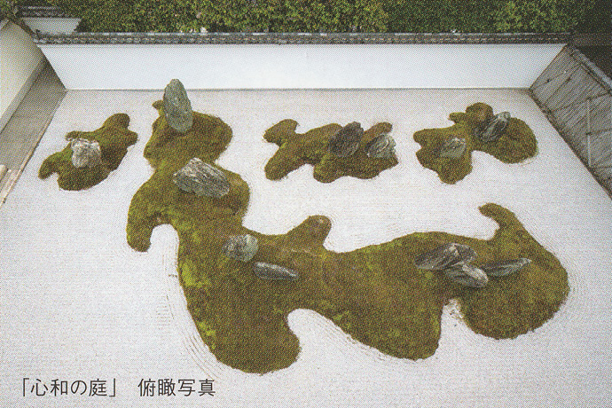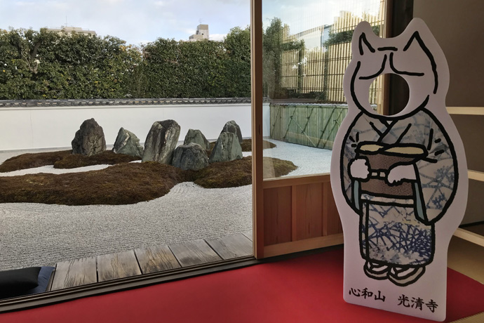本堂の前に広がるのは「心和(しんわ)の庭」。光清寺の山号にちなみ、12の石と苔で「心」の字が形作られています。池に中の島で心の字を描く例はありますが、枯山水では他に例がないそうです。