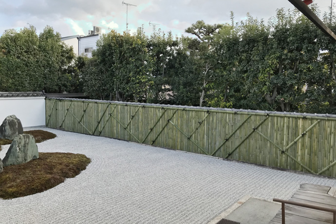 庭の南は竹垣で区切られていて、斜めの竹が心の字を表すデザインになっています。