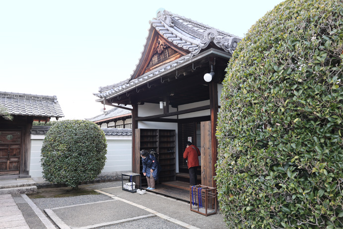 左に見える中門は年代不明ですが当寺で最古の建物で、扉に開基の伏見宮家の家紋(十四裏菊)の透かし彫りがあります(最後の写真)。中央の玄関が拝観入口です。
