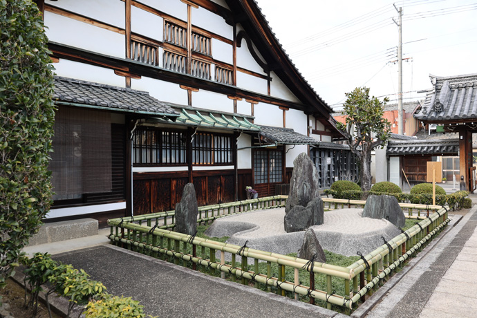神仙世界にあるという「蓬莱」「方丈」「瀛洲(えいしゅう)」「壺梁(こりょう)」の四島に見立てて、広がる白砂が大海を表した枯山水庭園となっています。