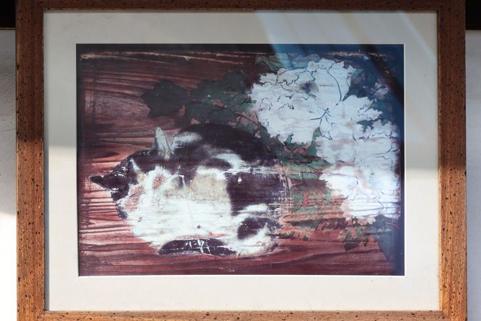 本堂には出水の七不思議に数えられる「浮かれ猫の絵馬」と呼ばれる、猫と牡丹と蝶が描かれた絵馬が展示してありました。以前は山門脇の弁天堂にありましたが、痛みを防ぐために複製と置き換えたそうです。