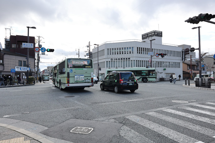 神社を後に、東山三条の交差点まできました。東山三条は東大路通と三条通の交差点のことで、東大路通の旧名「東山通」が交差点やバス停に残っています。東西、南北の通り名のどちらが先になるかは慣例で、大きな通りが先のことが多いようです。