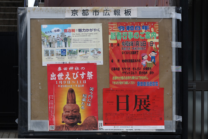 京都市広報版、町内の催し物が掲示してあります。左下は粟田神社の「出世えびす祭」1月9日~11日、この辺りは氏子地域です。右下は京都市京セラ美術館で開催されている「日展」2025年12月20日~2026年1月17日です。
