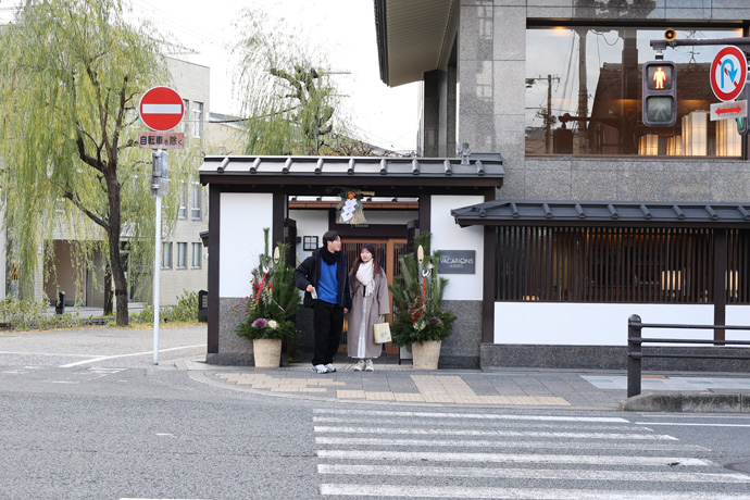 マンションの「パークウォーク京都東山」、ここにも門松がありました。右に坂本龍馬・お龍「結婚式場」跡の石碑が見えます。