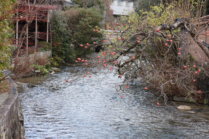 白川の三条橋から上流方向、柿が熟していますが、誰も採れない場所です。
