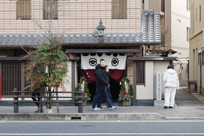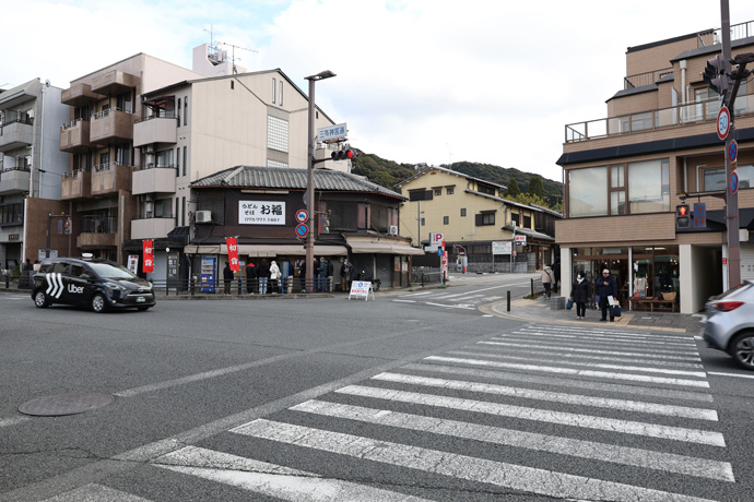 「三条神宮道」の交差点に来ました。南東の角は「うどんそば お福」、よく見ると欧米の方が並んでいてちょっと驚きました(最後の写真)。初詣のノボリは東にある粟田神社のものです。