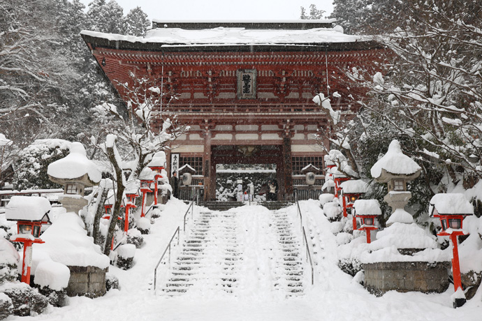 下は先日の鞍馬寺仁王門前で、下りの石段や参道は雪で滑りやすくなっていました。最後の写真は仁王門の端正な扁額、後水尾天皇宸筆といわれています。