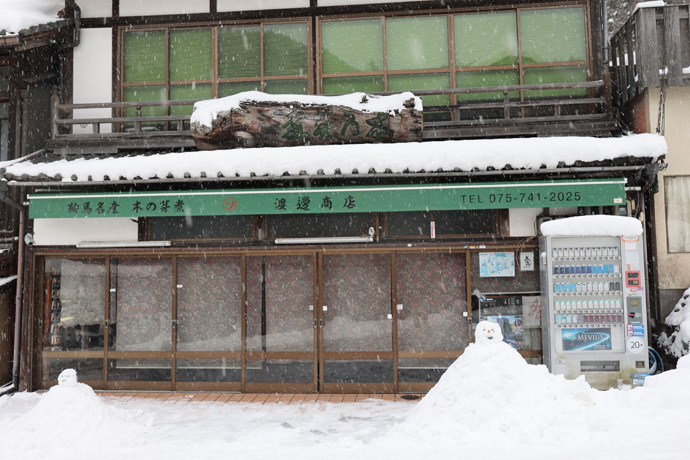左は土産物と佃煮の「岸本柳蔵老舗駅前店」、「木の芽煮」が有名ですが、鞍馬では珍しく「ちりめん山椒」も扱っています。その向うに鞍馬街道が通っています。