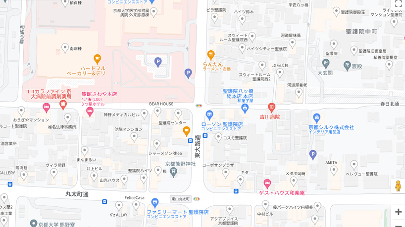 後に京都大学付属病院が建設され、地蔵尊はこの地に遷されました。下のGoogleMapで中央の東西の通りが春日北通で、白川北殿はこの通りの西にあります。中央の南北の通りは東大路通で、粟田宮や地蔵尊は交差点の北西にありました。