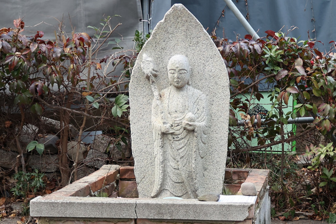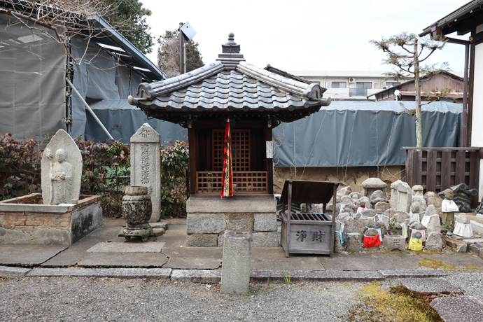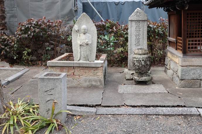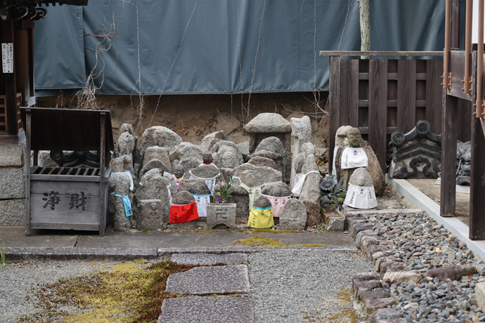 右端に「三高地蔵」と呼ばれる地蔵尊があります。 かつて、第三高等学校(京大学部の前身)構内にあり、学園祭で当時の学生が多くの地蔵を赤褌に裸で担いだ後に、運動場の片隅に放置したままになっていたそうです。