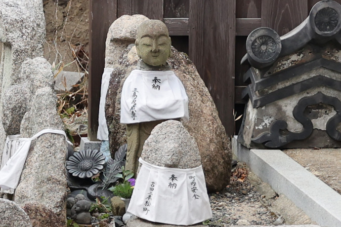 それを目にした左京区吉田二本松町の長老が、相談の上に一体を町内に遷し町の守りに祀ることにしました。その後、2013年頃に近隣町民だけで世話が困難になり、積善院に奉納されたといわれています。前の石仏には吉田二本松町という前掛があります。