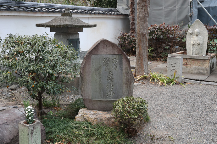 この事件は、近松門左衛門の人形浄瑠璃「近頃河原達引」の題材となり、1952年に義太夫の豊竹山城少椽らよってこの塚が立てられました。そこには、「やつす姿の女夫連れ名を絵草紙に聖護院森をあてどにたどり行く」とあります。