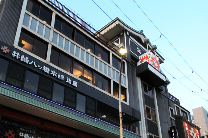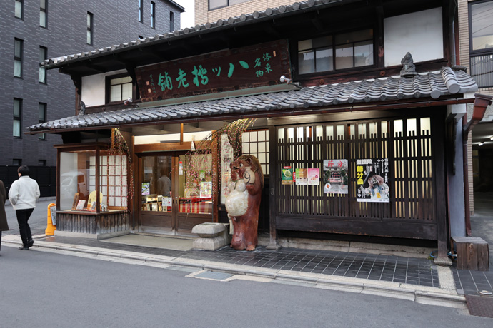 2020年、京都地裁は創業年の真偽には立ち入らず、「歴史の古さが消費者の行動を左右する事情とはいえない」として原告の損害賠償の訴えを退けました。上は「八ッ橋西尾為忠商店」、下は川端四条上るにある「井筒八ツ橋本舗」、建物は井筒ビル。