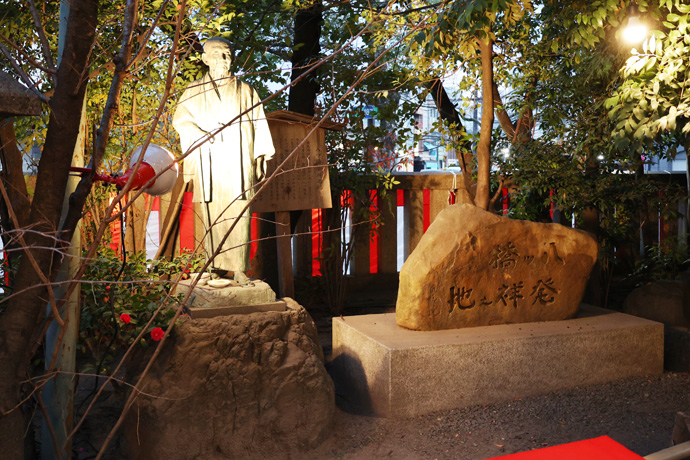 本殿にお詣りしたあと、境内の北東のテントの方にいきました。テントの前(写真の右奥)には「八ッ橋」に関する石碑と銅像があります。